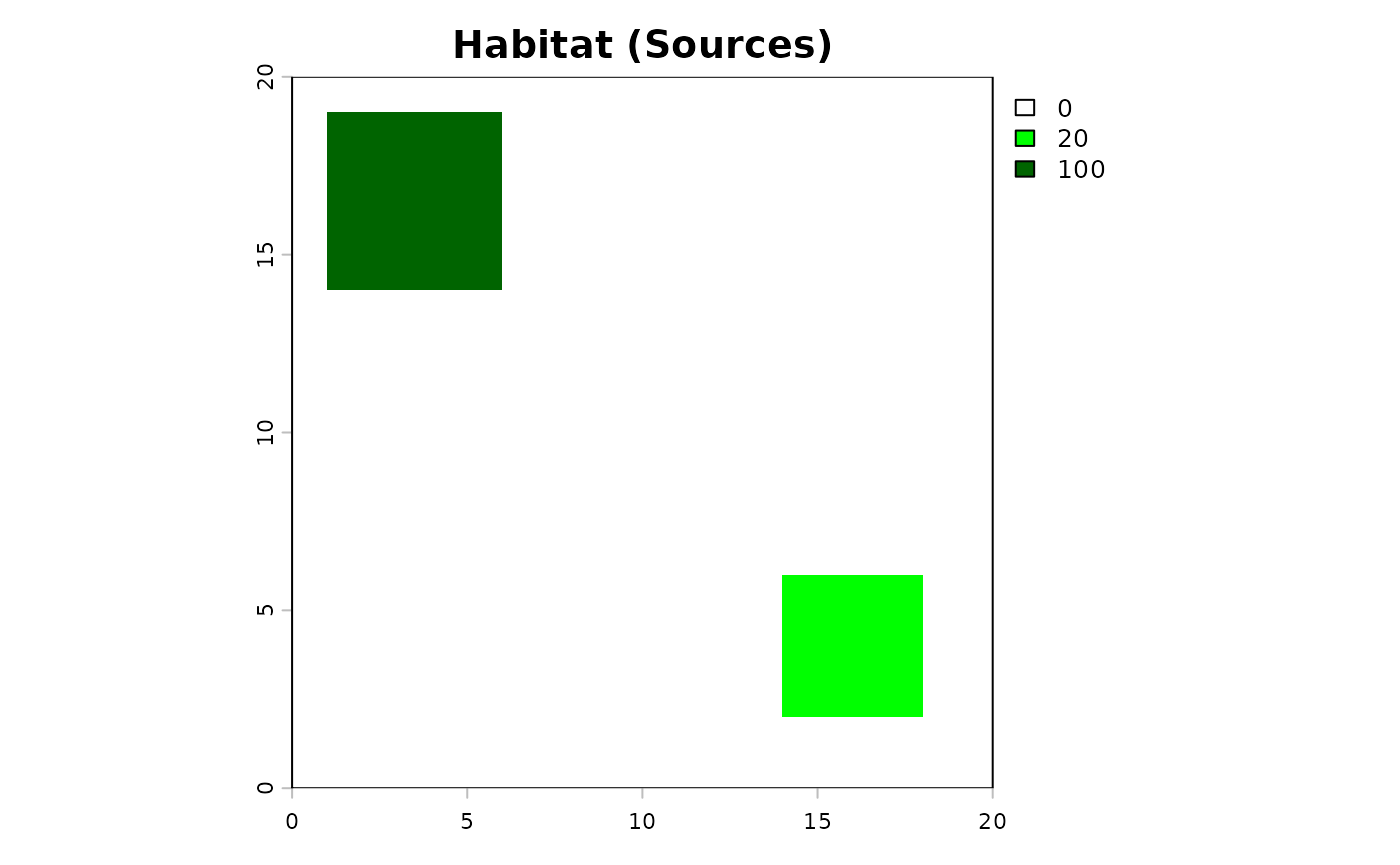 terra::plot(rast_habitat, main = "Habitat (Sources)", col = c("white", "green", "darkgreen"))